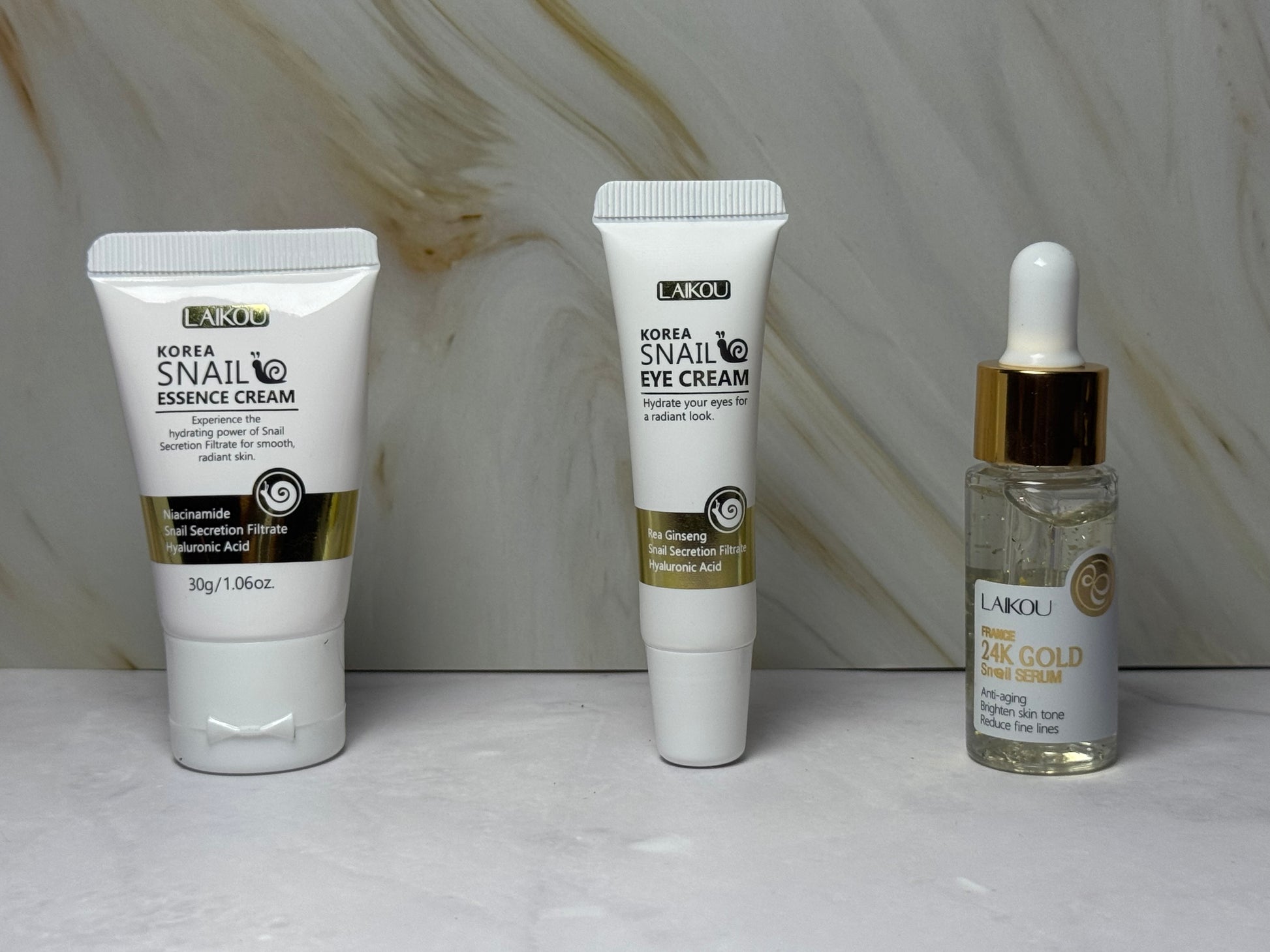 The Laikou Snail Revitalizing Set combines three power products designed to restore and protect your skin. Infused with snail secretion filtrate, this trio targets skin repair, hydration, and anti-aging care.